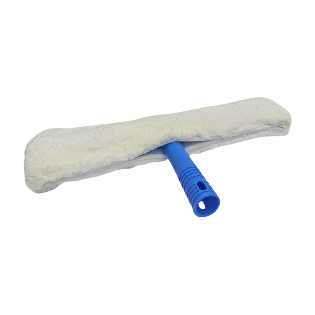 The sleeve, which slips over the cross arm of the T-bar, is made of acrylic plush fabric with high water absorption and a soft, dense pile that gently lifts dirt without scratching the glass. The sleeve is secure with an elastic to loop around the t-bar, and has reinforced edges to improve durability.